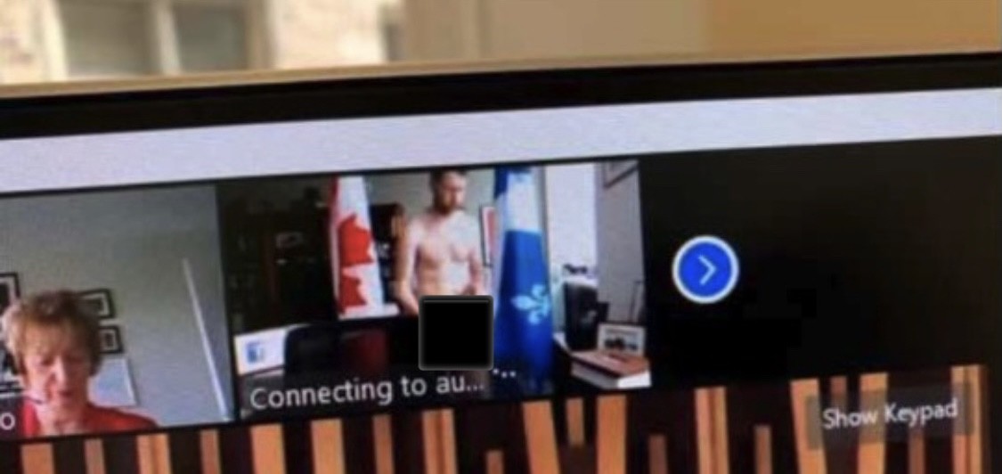 ونشرت الوكالات الكندية صورة الشاشة التي تظهر النائب "آموس" يقف عارياً خلف مكتبه بين علم الكيبيك والعلم الكندي.