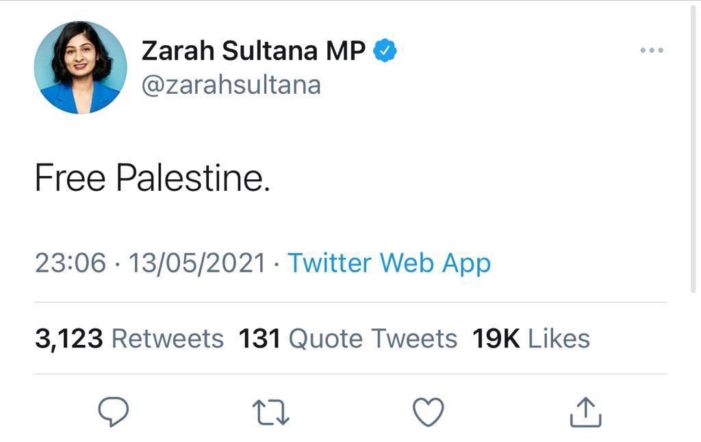 نشرت عضو حزب العمال البريطاني النائبة "زارة سلطانة" تغريدة على حسابها الشخصي عبر تويتر عبرت فيها عن تضامنها مع فلسطين وغزة. وكتب في التغريدة عبارة من كلمتين تقول: "فلسطين حرة".