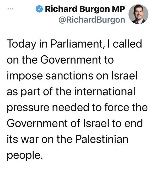 نشر النائب البريطاني "ريتشارد بورغون" تغريدة عبر حسابه الخاص على تويتر يقول فيها: " طالبت اليوم الحكومة البريطانية خلال جلسة البرلمان بالتدخل الفوري لإنقاذ الفلسطينيين.