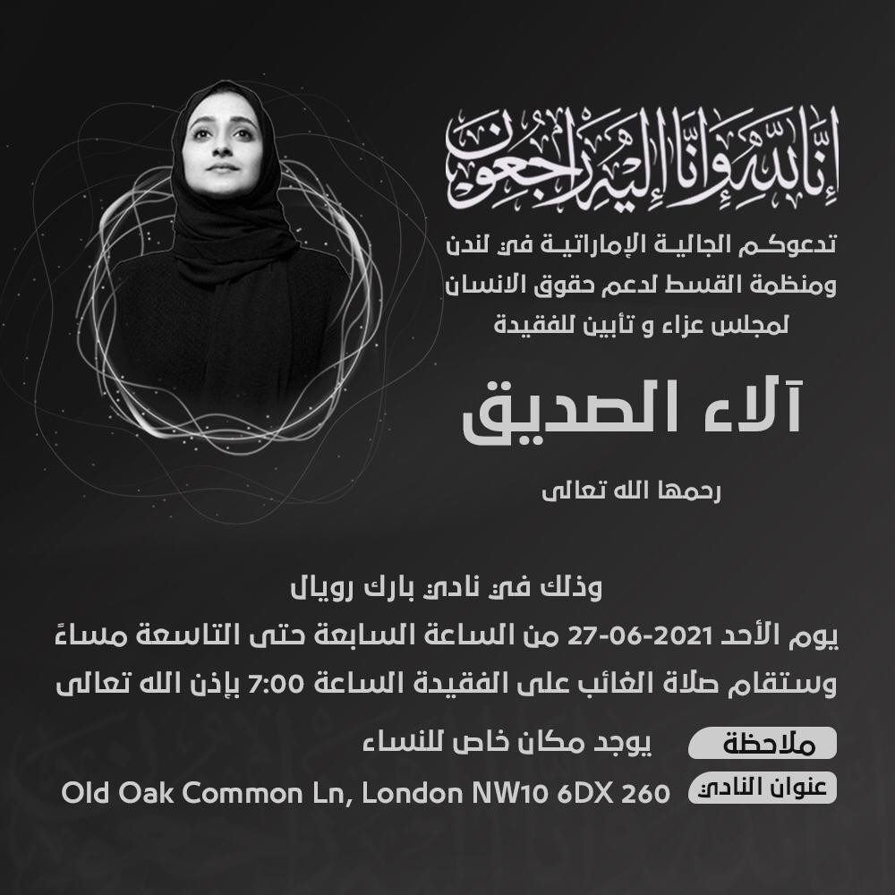 أعلنت الجالية الإماراتية في لندن ومنظمة القسط لدعم حقوق الإنسان عن إقامة مجلس عزاء وتأبين للناشطة الراحلة آلاء الصديق.