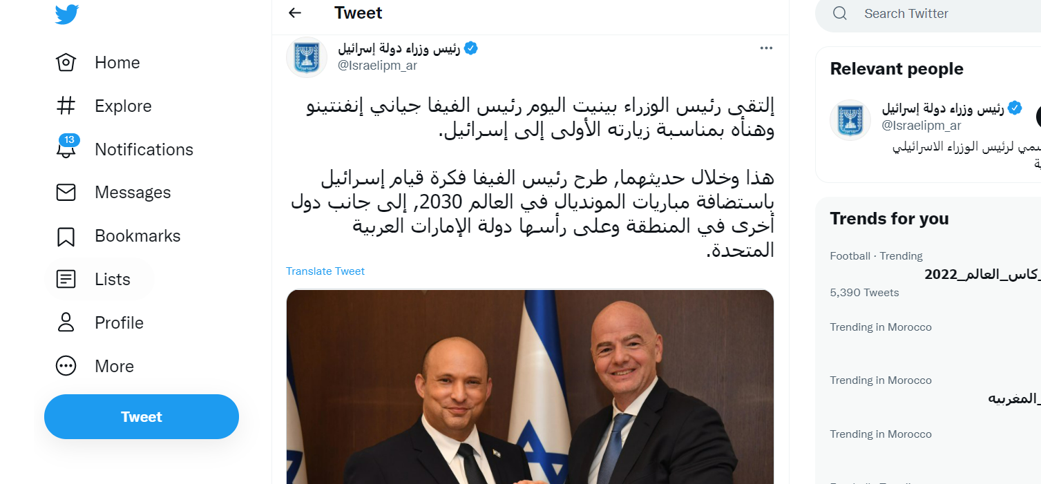 وجاء في الحساب الرسمي لرئيس وزراء دولة إسرائيل على موقع "تويتر" للتواصل الاجتماعي "تغريدة": "التقى رئيس الوزراء الإسرائيلي بينيت اليوم رئيس الفيفا جياني إنفنتينو وهنأه بمناسبة زيارته الأولى إلى إسرائيل. وطرح رئيس الفيفا فكرة قيام إسرائيل باستضافة مباريات المونديال في العالم 2030، إلى جانب دول أخرى في المنطقة وعلى رأسها دولة الإمارات العربية المتحدة".
