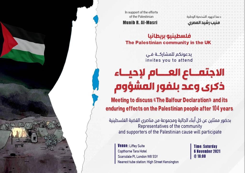يدعو فلسطينيو بريطانيا، أبناء الجالية العربية والفلسطينية، للمشاركة في "الاجتماع العام لإحياء ذكرى وعد بلفور المشؤوم" في لندن، للتنديد به ومطالبة الحكومة البريطانية بالاعتذار عنه.