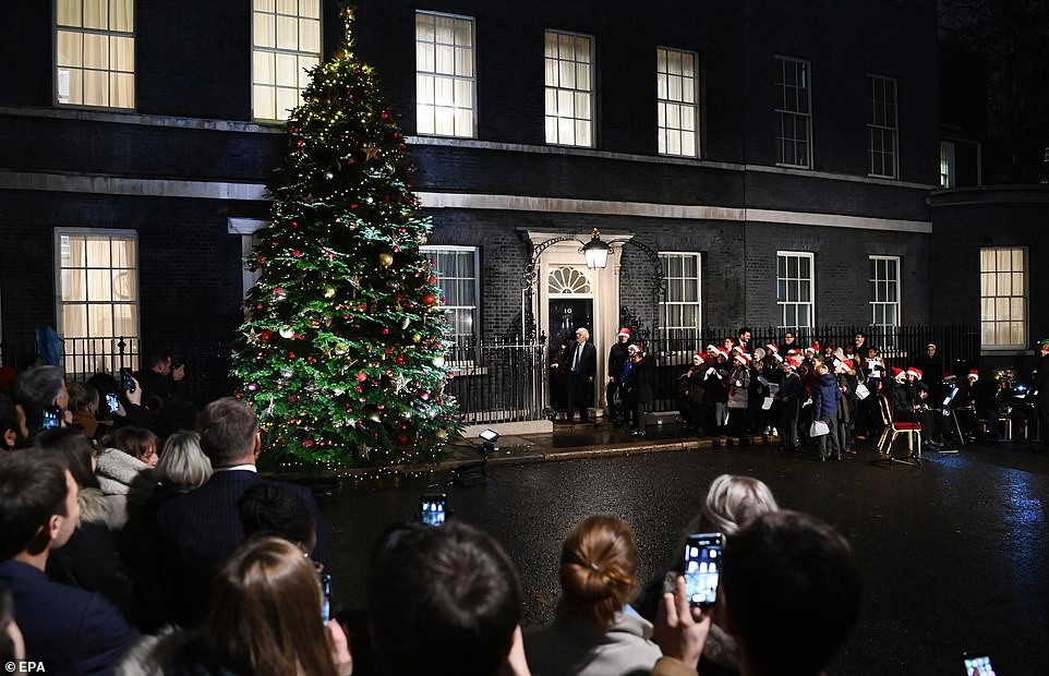 وأظهر مقطع الفيديو جونسون وهو يضيء الشجرة الضخمة الموضوعة خارج داونينج ستريت، برفقة مجموعة من الأطفال يغنون الترانيم في الأمسية الخاصة.