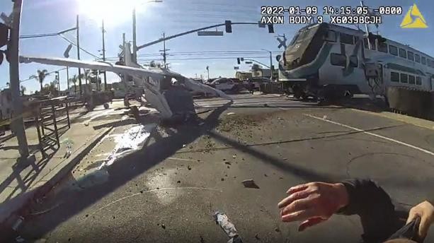 ويظهر مقطع الفيديو عناصر الشرطة وهم يسحبون الطي ار الجريح من قمرة القيادة. وبعد سحبه بخمس ثوان فقط اصطدم قطار سريع بالطائرة ما أد ى إلى تناثر حطامها.