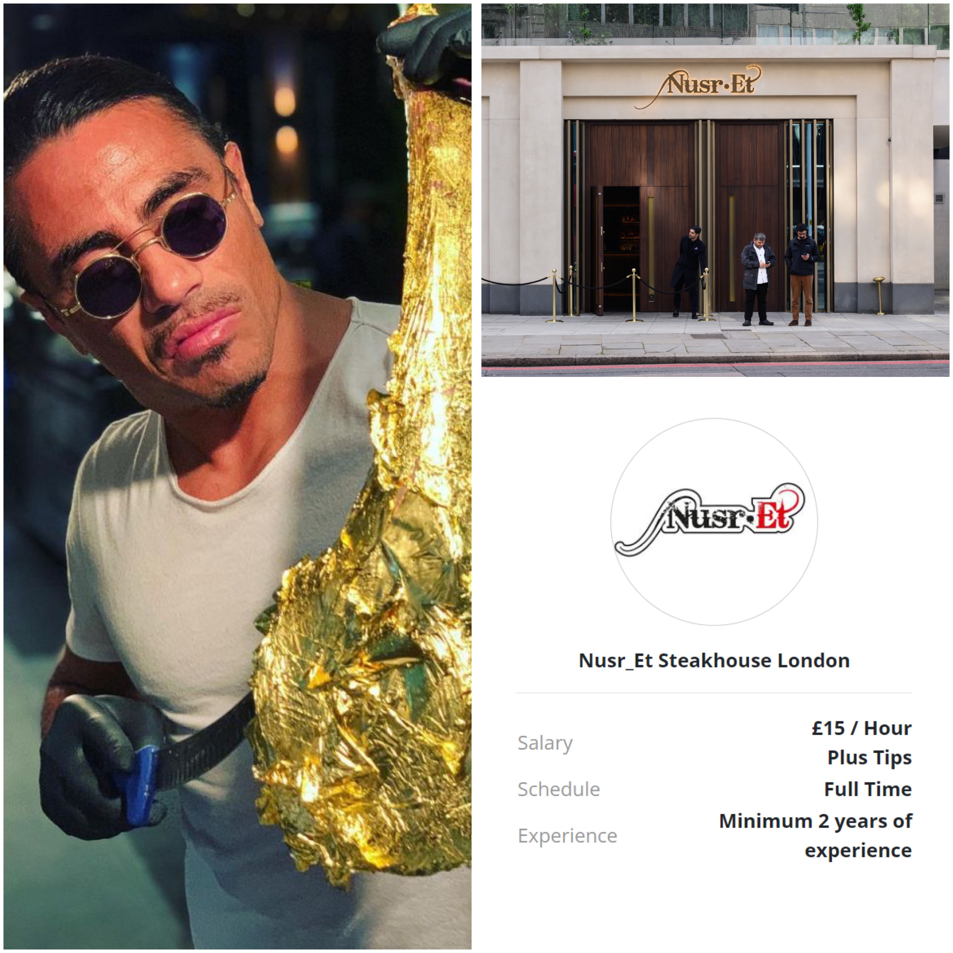 يبحث مطعم الشيف التركي نصرت غوكشيه المعروف بـ "SALT Bae" عن نُدل لمطعمه فرع لندن. وسيقدم المطعم للموظفين 15 جنيهاً إسترلينياً فقط في ساعة العمل الواحدة في المطعم الذي اشتهر بأنه أغلى مطاعم لندن.