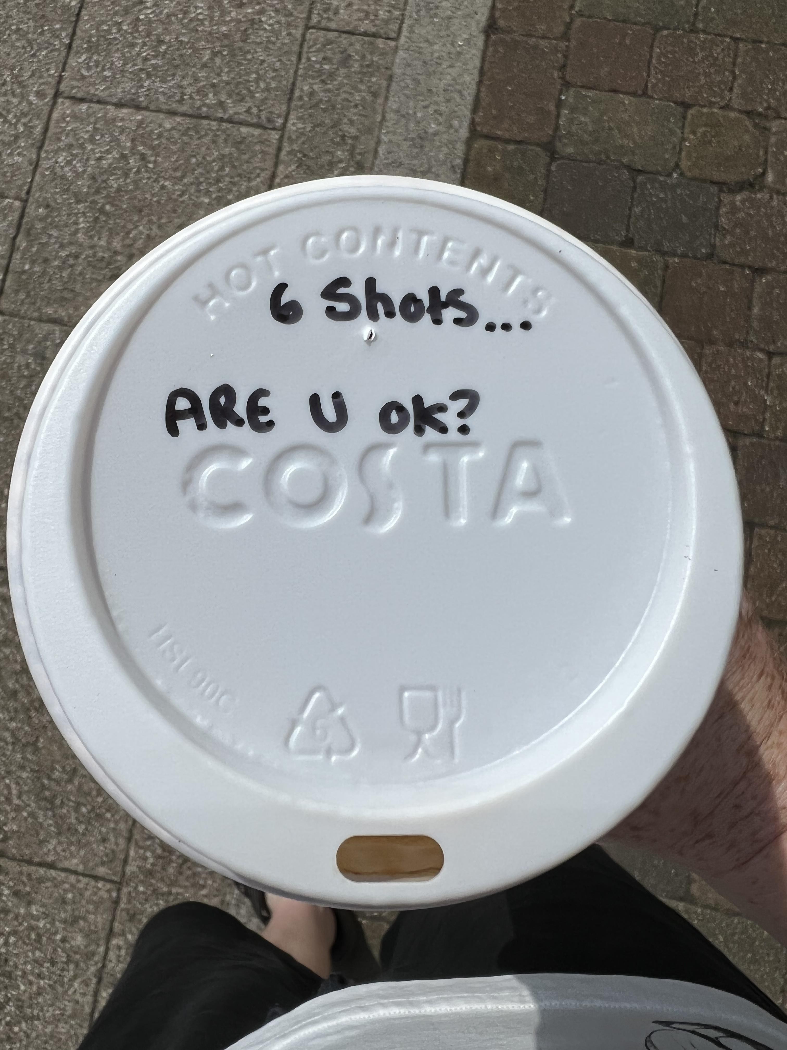 وبحسب صحيفة "ميرور"، قام مستخدم مجهول بمشاركة تجربته عبر منصة "Reddit"، قائلا أن الموظف سلّمه الكوب وكتب على غطائه : 6 شوتس من القهوة؟ هل أنت على ما يرام؟" .