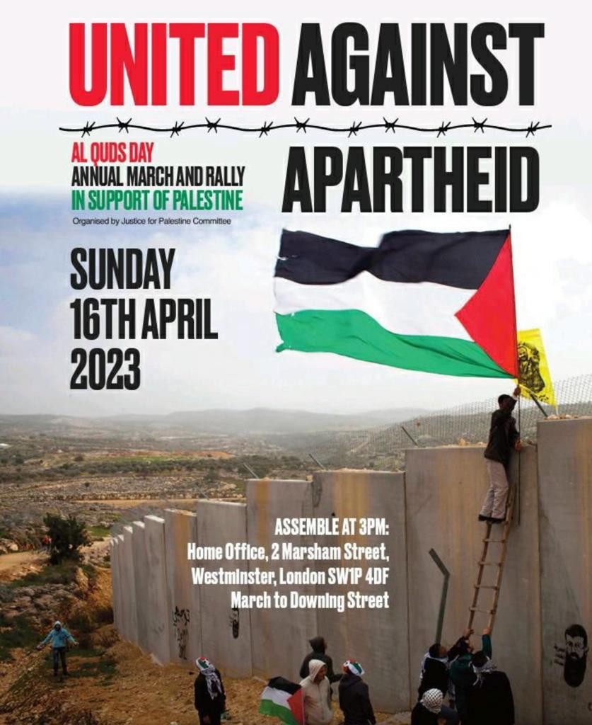 أعلن منظمو مسيرة العدالة لفلسطين عن موعد المسيرة السنوية لدعم فلسطين والتنديد بما تقوم به إسرائيل بحق الشعب الفلسطيني. والتي ستقام أمام مقر الحكومة البريطانية، يوم الأحد القادم 16 أبريل 2023، عند الساعة الثالثة مساءً.