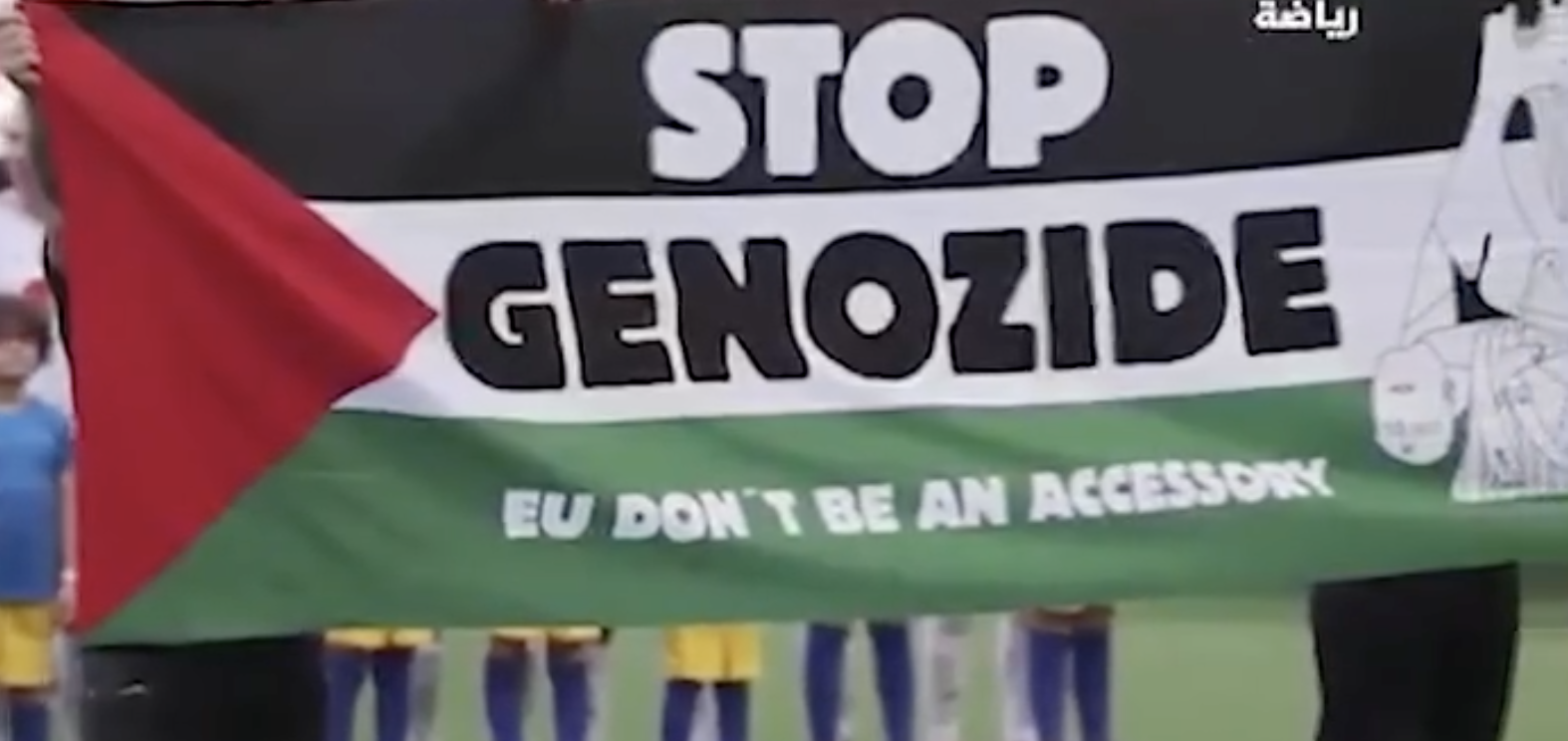 رُفع علم فلسطيني يحمل عبارة "أوقفوا الإبادة" في نهائي دوري أبطال أوروبا للسيدات، مساء يوم أمس السبت، في مباراة بين فريق برشلونة وأولمبيك ليون.