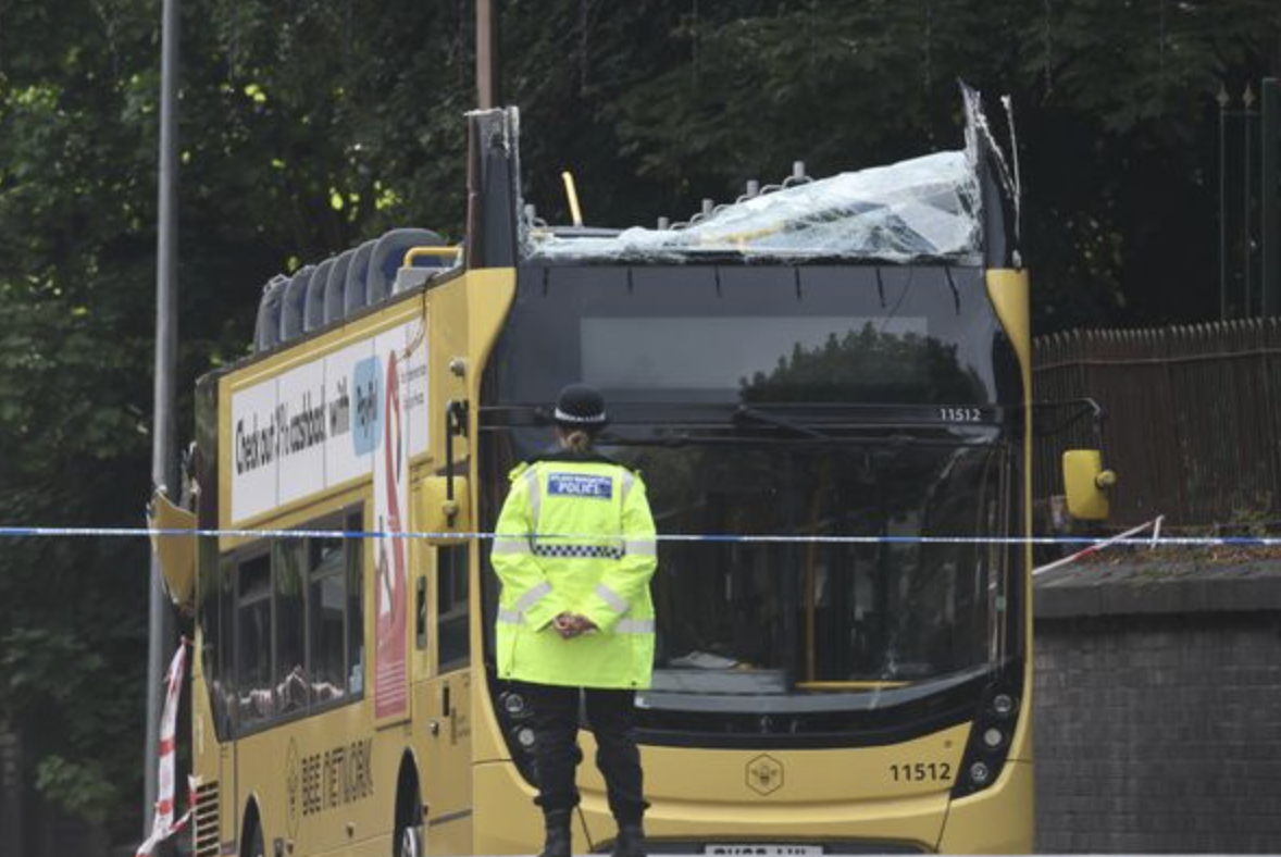 أُصيب 15 شخصًا، أحدهم في حالة حرجة، إثر اصطدام حافلة بطابقين بجسر منخفض في منطقة إيكولز، مانشستر الكبرى، عصر يوم الإثنين، ما أدى إلى اقتلاع سقف الطابق العلوي وتناثر الحطام في الشارع.