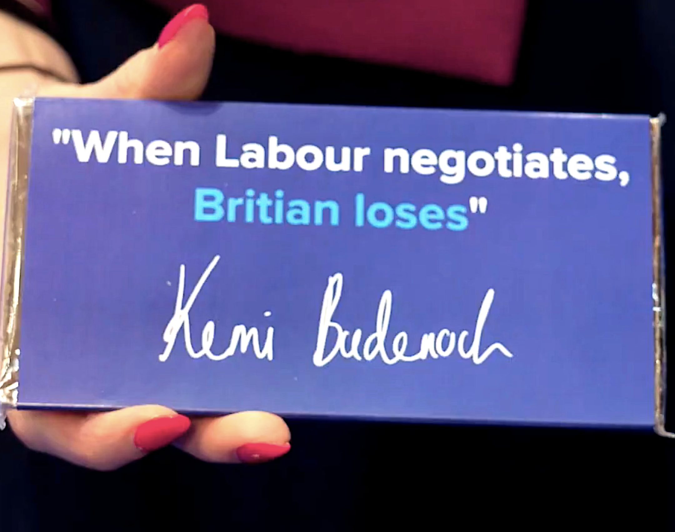 وحسب ما ذكرته صحيفة الغارديان “The Guardian” حملت عبارة: "عندما يتفاوض حزب العمال، Britian تخسر"، موقَّعة باسم زعيمة الحزب كيمي بادينوك. وقد أوضح المنظّمون أن الخطأ ناتج عن "مشكلة في الطباعة"، مؤكدين سحب الشوكولاتة من حقائب الهدايا، التي تضمنت أيضًا نسخة ساخرة من بيان حزب الإصلاح وصورًا لسيرة ذاتية "مزيفة" لوزيرة المالية العمالية راشيل ريفز.