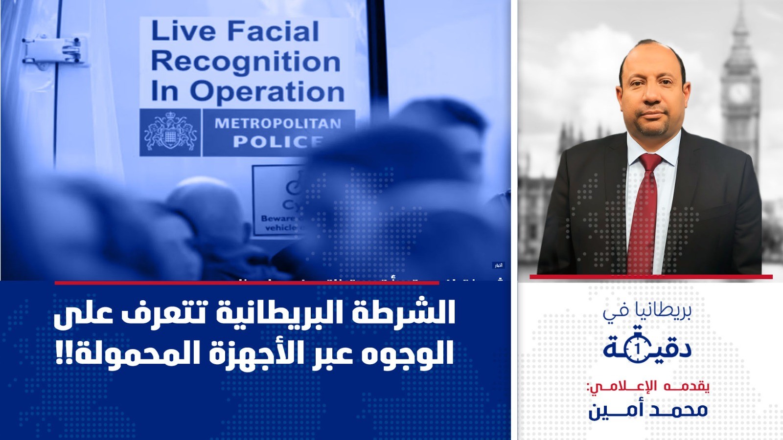 خصّص الإعلامي محمد أمين حلقة جديدة من برنامجه "بريطانيا في دقيقة" للحديث عن تجربة شرطة لندن لاستخدام أجهزة محمولة مزودة بتقنية التعرف على الوجوه لأول مرة، بهدف التحقق من هوية الأشخاص مباشرة في الميدان خلال فترة تجريبية مدتها ستة أشهر.