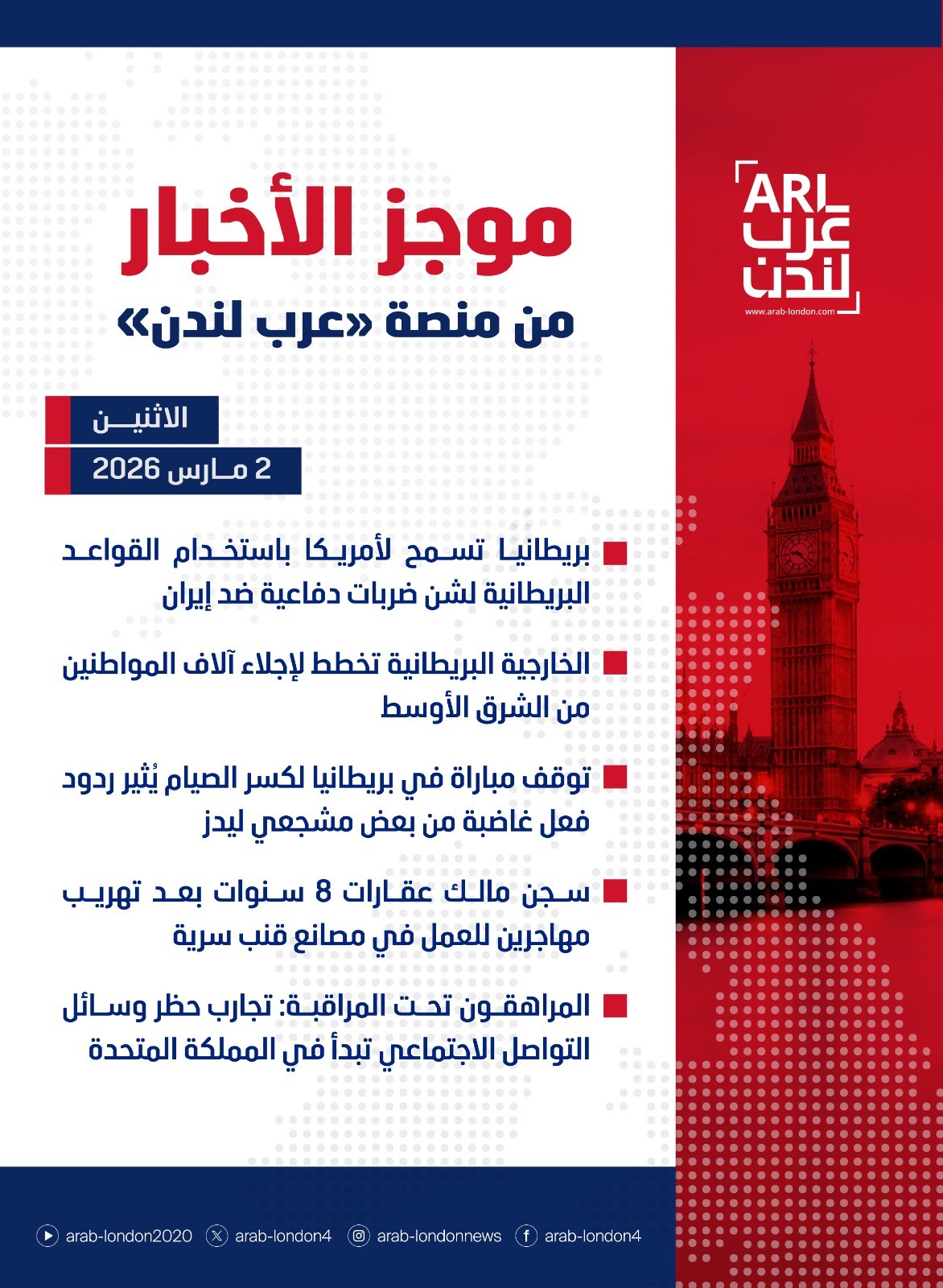 الرئيسية أخبار موجز أخبار بريطانيا من منصة عرب لندن: الاثنين : 2 مارس/آذار 2026 أخبار موجز أخبار بريطانيا من منصة عرب لندن: الاثنين : 2 مارس/آذار 2026 2026-03-02 🔴 بريطانيا تسمح لأمريكا باستخدام القواعد البريطانية لشن ضربات دفاعية ضد إيران 🔴 الخارجية البريطانية تخطط لإجلاء آلاف المواطنين من الشرق الأوسط 🔴 توقف مباراة في بريطانيا لكسر الصيام يُثير ردود فعل غاضبة من بعض مشجعي ليدز 🔴 سجن مالك عقارات 8 سنوات بعد تهريب مهاجرين للعمل في مصانع قنب سرية 🔴 المراهقون تحت المراقبة: تجارب حظر وسائل التواصل الاجتماعي تبدأ في المملكة المتحدة السابق 10 دولارات لكوب كابتشينو واحد في مطار سيدني... مؤثرة أسترالية تكشف الفاتورة التالي توقف مباراة في بريطانيا لكسر الصيام يُثير ردود فعل غاضبة من بعض مشجعي ليدز تابعوا آخر أخبار عرب لندن عبر Google News الاكثر قراءة واشنطن تُقيّد تسليم ملفات إبستين وبريطانيا تواجه عوائق قانونية 2026-04-25 شبانة محمود لا تستبعد ترحيل طالبي اللجوء الأفغان المرفوضين 2026-04-25 لندن تستضيف اجتماعاً لأكثر من 30 دولة لبحث أمن مضيق هرمز 2026-04-22 شرطة لندن تنتقد قرار فصل موظف دافع عن متجره ضد عملية سرقة 2026-04-23 خاص لعرب لندن| السوريون في بريطانيا يترقبون مآلات ملفات اللجوء بعد زيارة الشرع 2026-04-21 مخابز Greggs تنقل منتجاتها خلف طاولات مضادة للسرقة بعد تصاعد السرقات 2026-04-26 مقالات ذات صلة بريطانيا في دقيقة| الكشف عن شبكة لإبستين في بريطانيا… شقق للاتجار بالجنس بين لندن وباريس!! 2026-04-28 بريطانيا تسجل ثالث أعلى معدل للعاطلين عن العمل والتعليم في أوروبا 2026-04-28 أزمة حقوقية في بريطانيا: 150 منظمة تهاجم خطط الحكومة لترحيل الأطفال قسراً 2026-04-28 الملك تشارلز والملكة كاميلا يلتقيان بعائلة ترامب في البيت الأبيض 2026-04-28 إنقاذ 106 مهاجرين في القنال بعد أيام من صفقة الـ662 مليون بين لندن وباريس 2026-04-28