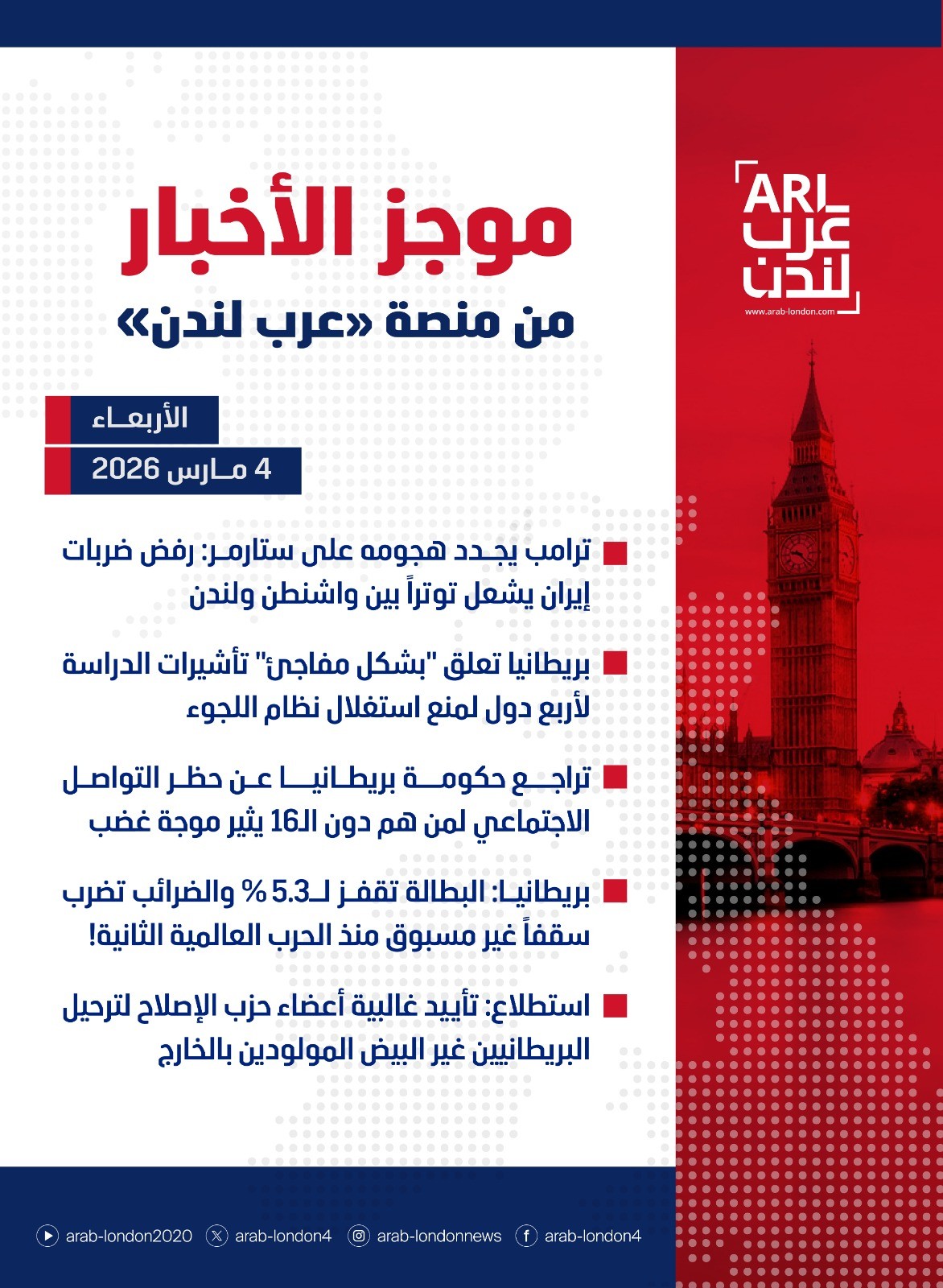 الرئيسية أخبار موجز أخبار بريطانيا من منصة عرب لندن: الأربعاء : 4 مارس/آذار 2026 أخبار موجز أخبار بريطانيا من منصة عرب لندن: الأربعاء : 4 مارس/آذار 2026 2026-03-04 🔴ترامب يجدد هجومه على ستارمر: رفض ضربات إيران يشعل توتراً بين واشنطن ولندن 🔴بريطانيا تعلق "بشكل مفاجئ" تأشيرات الدراسة لأربع دول لمنع استغلال نظام اللجوء 🔴تراجع حكومة بريطانيا عن حظر التواصل الاجتماعي لمن هم دون الـ16 يثير موجة غضب 🔴بريطانيا: البطالة تقفز لـ 5.3% والضرائب تضرب سقفاً غير مسبوق منذ الحرب العالمية الثانية! 🔴استطلاع: تأييد غالبية أعضاء حزب الإصلاح لترحيل البريطانيين غير البيض المولودين بالخارج السابق مكتب مسؤولية الميزانية يتوقع مغادرة 50 ألف بريطاني إضافي سنوياً حتى 2030 التالي تراجع حكومة بريطانيا عن حظر التواصل الاجتماعي لمن هم دون الـ16 يثير موجة غضب تابعوا آخر أخبار عرب لندن عبر Google News الاكثر قراءة واشنطن تُقيّد تسليم ملفات إبستين وبريطانيا تواجه عوائق قانونية 2026-04-25 شبانة محمود لا تستبعد ترحيل طالبي اللجوء الأفغان المرفوضين 2026-04-25 لندن تستضيف اجتماعاً لأكثر من 30 دولة لبحث أمن مضيق هرمز 2026-04-22 شرطة لندن تنتقد قرار فصل موظف دافع عن متجره ضد عملية سرقة 2026-04-23 خاص لعرب لندن| السوريون في بريطانيا يترقبون مآلات ملفات اللجوء بعد زيارة الشرع 2026-04-21 مخابز Greggs تنقل منتجاتها خلف طاولات مضادة للسرقة بعد تصاعد السرقات 2026-04-26 مقالات ذات صلة بريطانيا في دقيقة| الكشف عن شبكة لإبستين في بريطانيا… شقق للاتجار بالجنس بين لندن وباريس!! 2026-04-28 بريطانيا تسجل ثالث أعلى معدل للعاطلين عن العمل والتعليم في أوروبا 2026-04-28 أزمة حقوقية في بريطانيا: 150 منظمة تهاجم خطط الحكومة لترحيل الأطفال قسراً 2026-04-28 الملك تشارلز والملكة كاميلا يلتقيان بعائلة ترامب في البيت الأبيض 2026-04-28 إنقاذ 106 مهاجرين في القنال بعد أيام من صفقة الـ662 مليون بين لندن وباريس 2026-04-28
