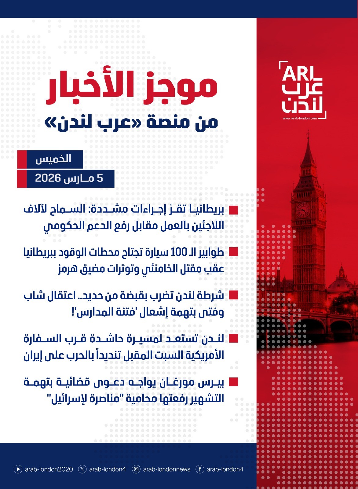 الرئيسية أخبار موجز أخبار بريطانيا من منصة عرب لندن: الجمعة: 6 مارس/آذار 2026 أخبار موجز أخبار بريطانيا من منصة عرب لندن: الجمعة: 6 مارس/آذار 2026 2026-03-06 🔴اعتقال 10 أشخاص بينهم بريطانيون للاشتباه في تجسسهم لصالح إيران في لندن 🔴لامي يصف تسريب تفاصيل اجتماع أمني سري حول إيران بـ "المهزلة" ويطالب بفتح تحقيق 🔴أولى رحلات الإجلاء البريطانية تحط في لندن وسط تحديات لوجستية وانتقادات لـ "فوضى التنظيم" 🔴اعتقال زوج نائبة بريطانية واثنين آخرين للاشتباه بالتجسس لصالح الصين 🔴بعد العثور على 600 قطعة سلاح.. إدانة بريطاني مهووس بالنازية بتهم إرهابية السابق وزير أيرلندي يندد بالإساءة لعمال محطات الوقود بسبب ارتفاع الأسعار التالي لامي يصف تسريب تفاصيل اجتماع أمني سري حول إيران بـ "المهزلة" ويطالب بفتح تحقيق تابعوا آخر أخبار عرب لندن عبر Google News الاكثر قراءة واشنطن تُقيّد تسليم ملفات إبستين وبريطانيا تواجه عوائق قانونية 2026-04-25 شبانة محمود لا تستبعد ترحيل طالبي اللجوء الأفغان المرفوضين 2026-04-25 لندن تستضيف اجتماعاً لأكثر من 30 دولة لبحث أمن مضيق هرمز 2026-04-22 شرطة لندن تنتقد قرار فصل موظف دافع عن متجره ضد عملية سرقة 2026-04-23 خاص لعرب لندن| السوريون في بريطانيا يترقبون مآلات ملفات اللجوء بعد زيارة الشرع 2026-04-21 مخابز Greggs تنقل منتجاتها خلف طاولات مضادة للسرقة بعد تصاعد السرقات 2026-04-26 مقالات ذات صلة بريطانيا في دقيقة| الكشف عن شبكة لإبستين في بريطانيا… شقق للاتجار بالجنس بين لندن وباريس!! 2026-04-28 بريطانيا تسجل ثالث أعلى معدل للعاطلين عن العمل والتعليم في أوروبا 2026-04-28 أزمة حقوقية في بريطانيا: 150 منظمة تهاجم خطط الحكومة لترحيل الأطفال قسراً 2026-04-28 الملك تشارلز والملكة كاميلا يلتقيان بعائلة ترامب في البيت الأبيض 2026-04-28 إنقاذ 106 مهاجرين في القنال بعد أيام من صفقة الـ662 مليون بين لندن وباريس 2026-04-28