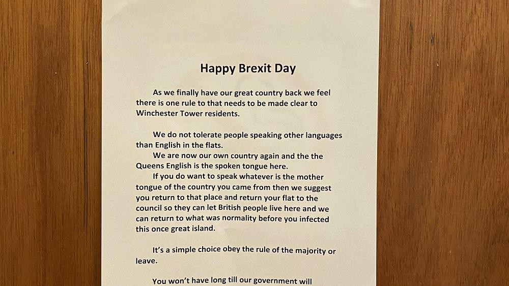 و كان الملصق الذي علق على باب مخرج الطوارئ في برج وينشستر، يحتوي على عبارات تأمر السكان بالتحدث باللغة الإنجليزية فقط، تحت عنوان يوم بريكست سعيد.