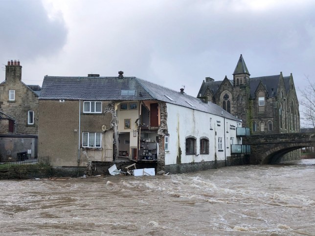 تساقط جزء من مقهى و فندق أمس الأحد في نهر "تيفيوت" في اسكتلندا بسبب عاصفة "سيارا" التي ضربت المملكة المتحدة.