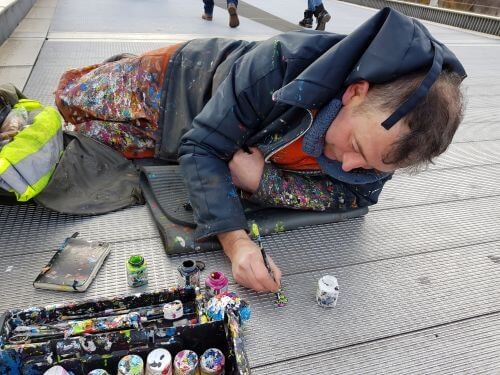 وقال لوكالة فرانس برس في صباح مشمس على جسر ميلينيوم في ظل كاتدرائية القديس بولس: "أحول القمامة إلى أعمال فنية، لذا فهذا يعتبر شكلا من أشكال إعادة التدوير". وأضاف وهو يحمل فرشاة للرسم في يده "هو اتخاذ إجراء غير مدروس ومحاولة تحويله إلى أمل إيجابي".