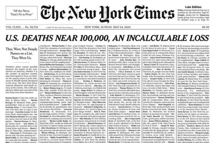 مع اقتراب الولايات المتحدة من تسجيل 100 ألف وفاة بسبب تفشي فيروس كورونا المستجد، خصصت صحيفة "نيويورك تايمز"، اليوم الأحد، صفحتها الأولى تكريما لألف شخص من بين الضحايا وخصصت سطرا لكل منهم.