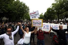 نظمت عشرات المظاهرات في كل أنحاء ألمانيا في إطار تحرك احتجاجي، يقام أسبوعيا منذ مطلع أبريل الماضي، ضد القيود المفروضة لاحتواء تفشي فيروس كورونا المستجد في البلاد.