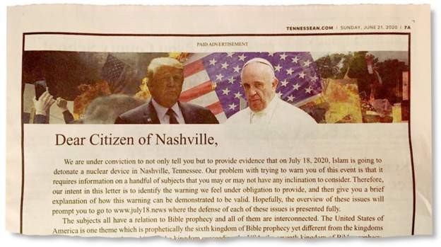 وزعم الإعلان المستند على آيات من الإنجيل تحمل نبوءة مستقبلية من تفجير المسلمين لقنبلة نووية في ناشفيل، تينيسي.