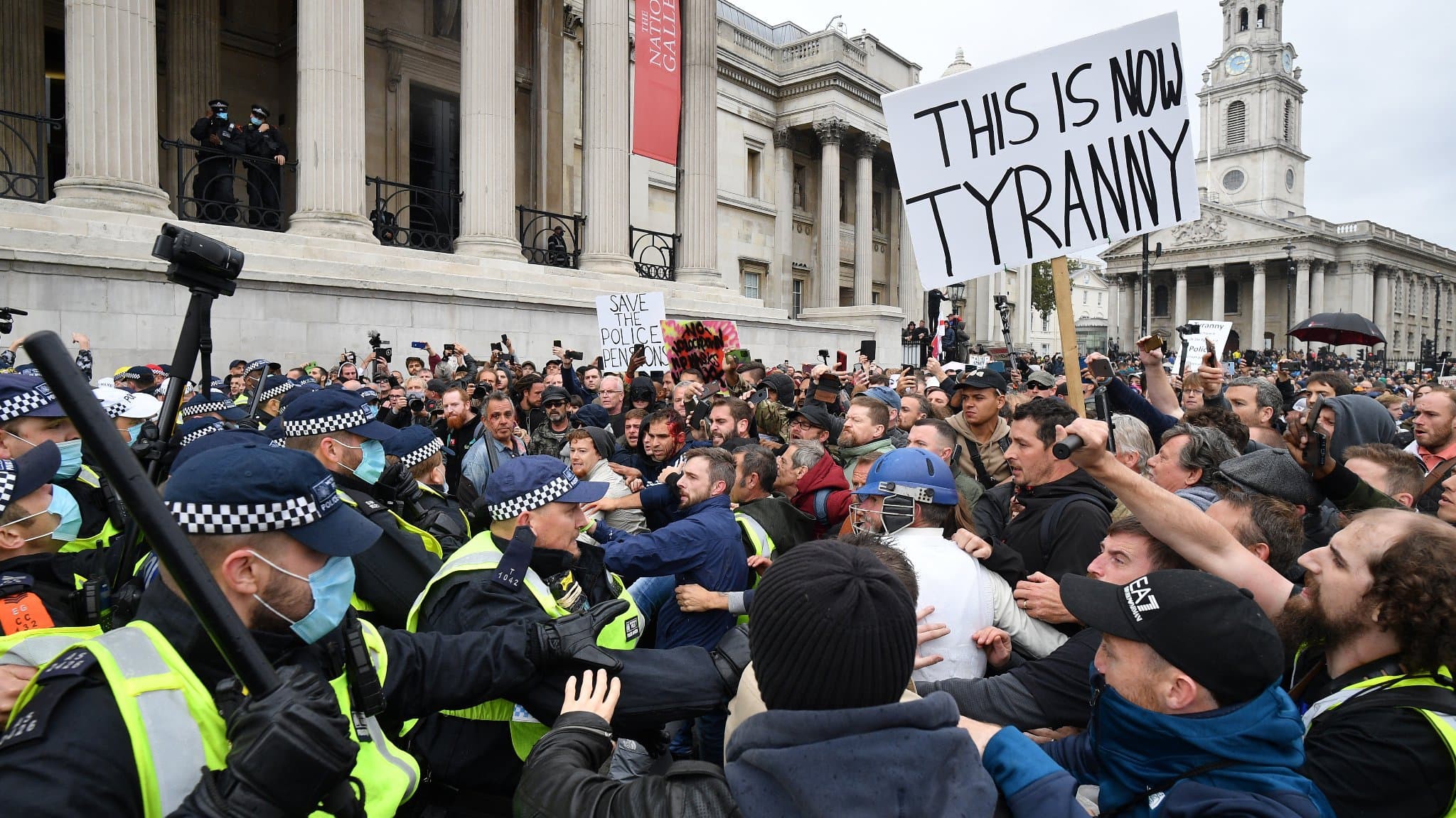أوقف عشرة أشخاص وأصيب أربعة عناصر شرطة بجروح، يوم أمس السبت، في لندن، خلال تظاهرات ضمت آلاف المعارضين للقيود المفروضة في المملكة المتحدة لاحتواء تفشي فيروس كورونا المستجد، كما أعلنت الشرطة.